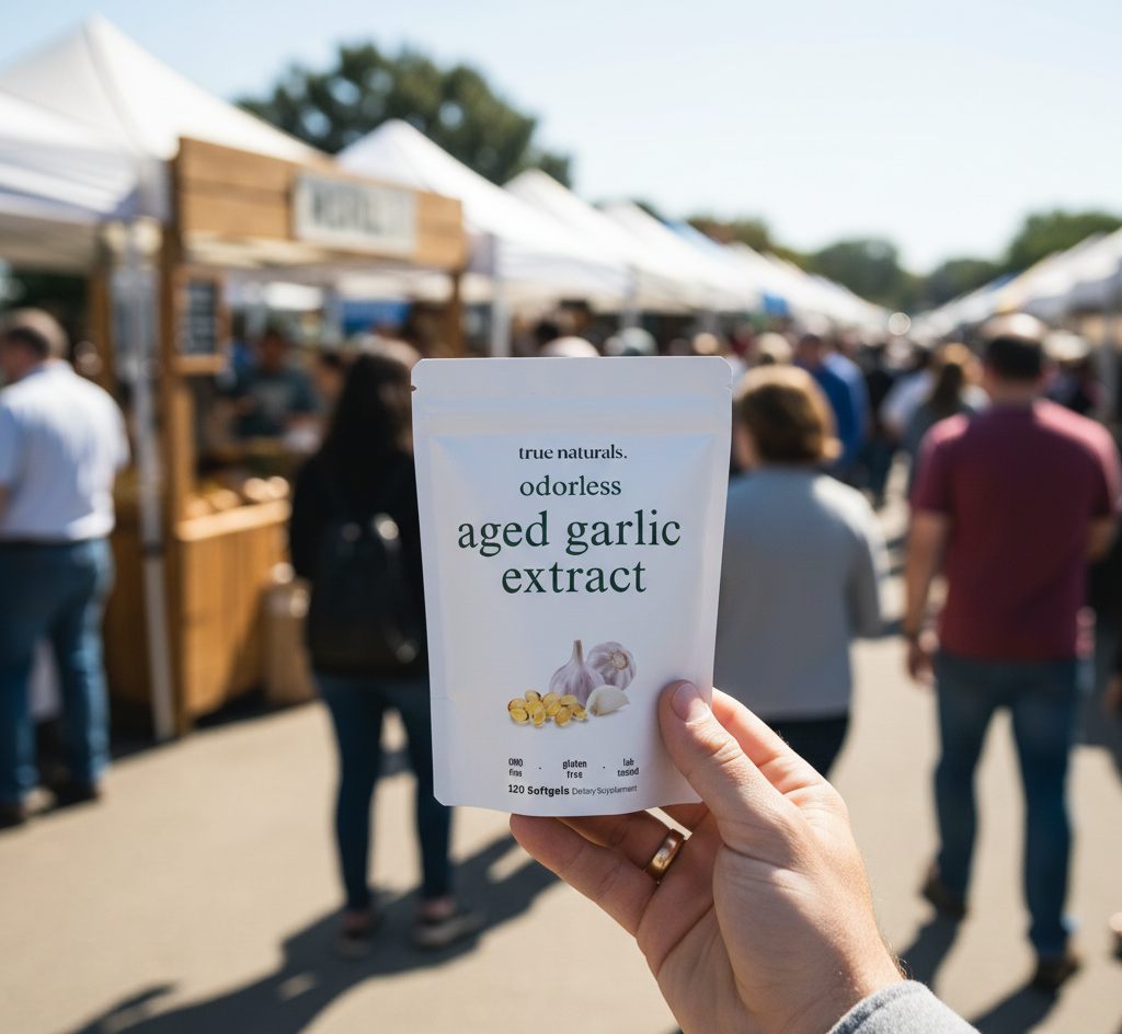 True Naturals Aged Garlic Extract helps promote healthy blood pressure and cardiovascular wellness, a crucial foundation your body needs for better circulation, more energy, and overall vitality.