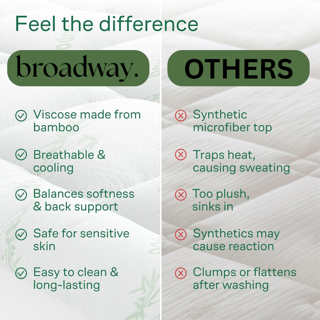 Over time, mattresses can lose their softness and structure — leading to tossing, stiffness, and restless nights. By combining memory foam cushioning, 7D down-alternative fill, and breathable bamboo fabric, the Broadway Topper gives your body the perfect blend of support, airflow, and softness it needs to sleep deeply and wake refreshed.