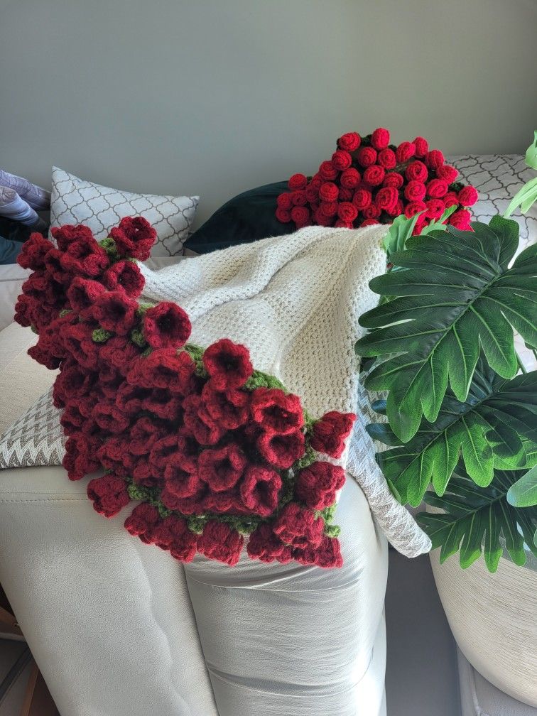 It’s a fully functional crocheted blanket designed to look like a bouquet of roses. Once unwrapped, it opens into a soft, breathable throw you can use on your bed, couch, or as décor.